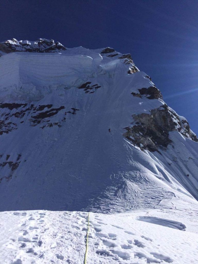 Topppushen på Ama Dablam är intensiv, kall och fullständigt elektrisk. Vi klättrar till höger om is-seracen, den berömda Dablam, vidare upp mot snöfältet under bergschrunden och följer sedan linjen hela vägen mot toppen.