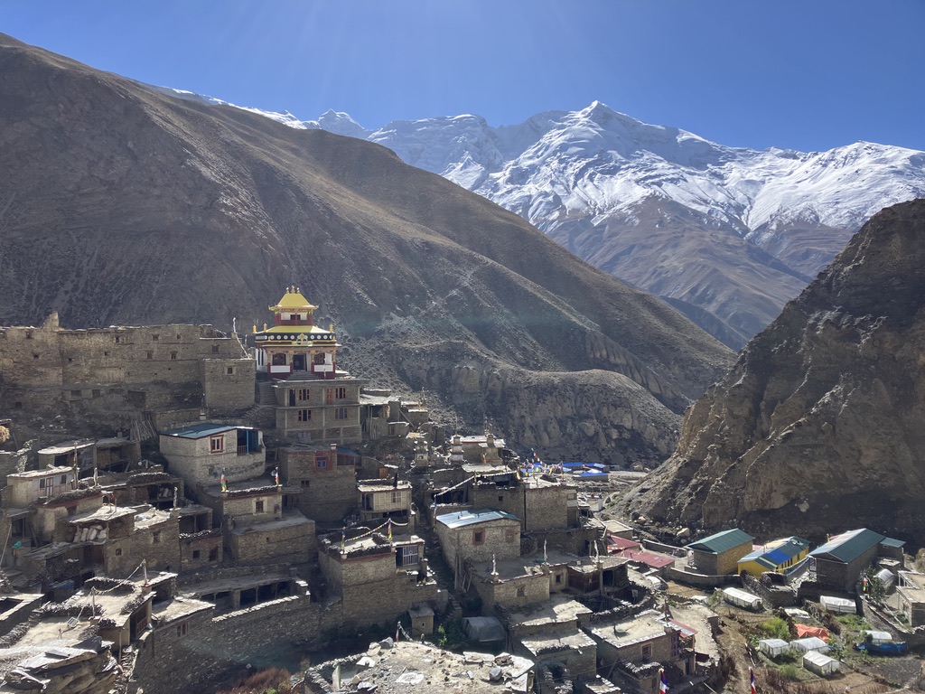 Den tibetanska kulturpåverkan syns tydligare här, med klostret som vaktar byn ovanifrån. Du börjar förstå att du inte längre befinner dig i vanliga världen. Det här är Himalaya på riktigt.