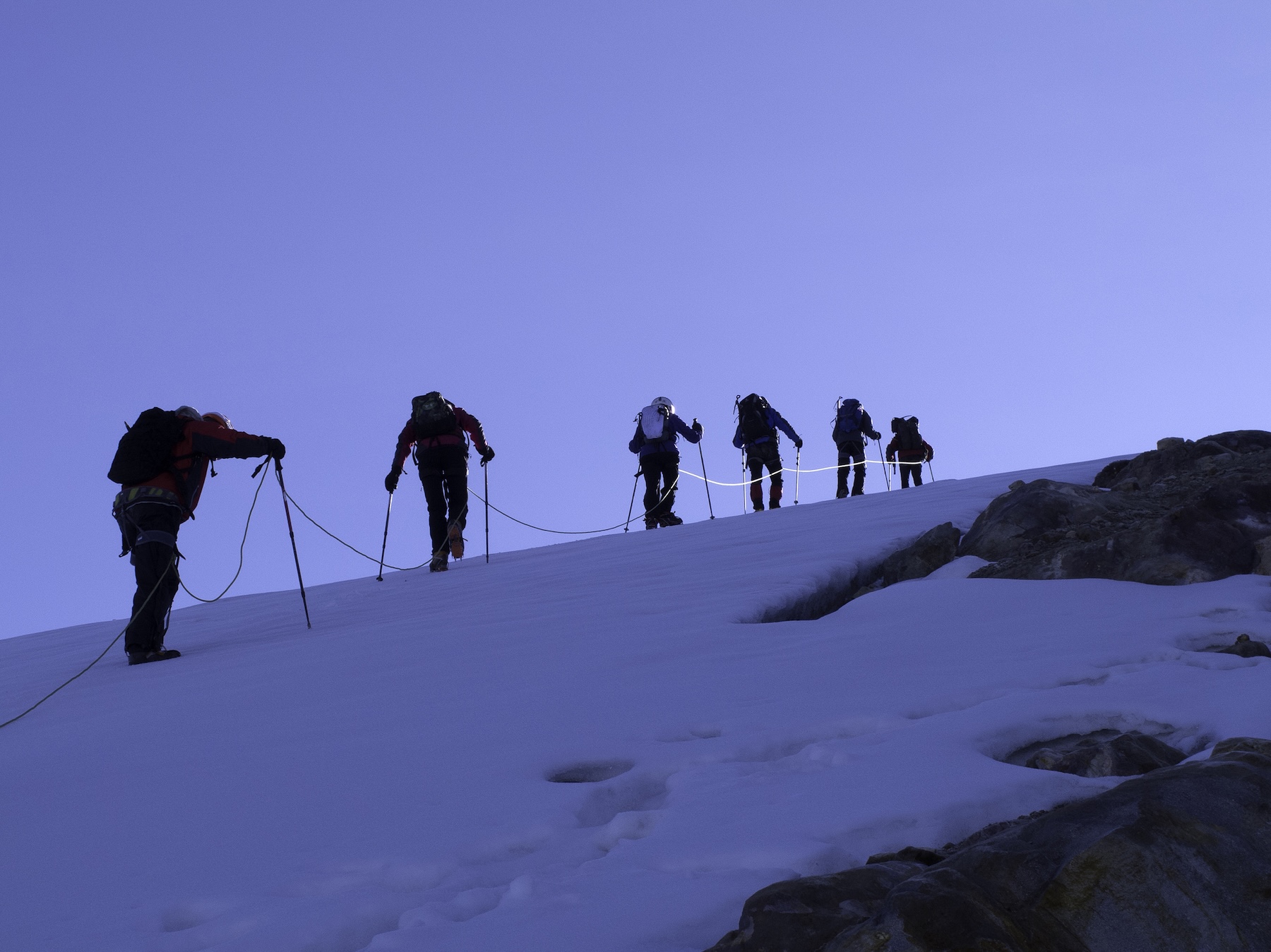Stigen bär dig upp via morän i varierande lutning, med partier av scrambling där händerna lika gärna behövs som fötterna. Vid 4 750 meters höjd når du glaciären – och här tar äventyret en ny dimension. Gruppen förbereder sig för glaciärvandring, tar sig uppåt i mjuk lutning, passerar isiga sektioner och klättrar mot platån vid huvudkratern. Strax därefter – toppen. 5 221 meter över havet.