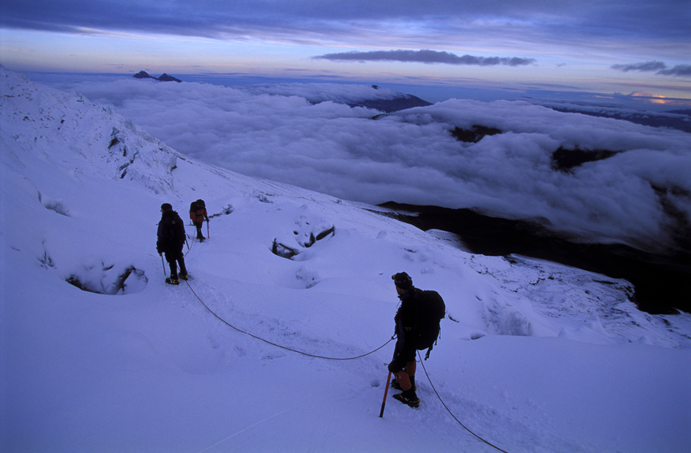 Bestigning av Cotopaxi börjar vid refugion på drygt 4 800 meter, varifrån klättringen till toppen tar dig genom glaciärisen under nattens svarta himmel, belyst av pannlampor och stjärnor. Framkomsten till kraterkanten vid soluppgång, med utsikten över vulkanlandskapet i det vaknade morgonljuset, är ett av de mest magiska ögonblick du kan uppleva som bergsklättrare.