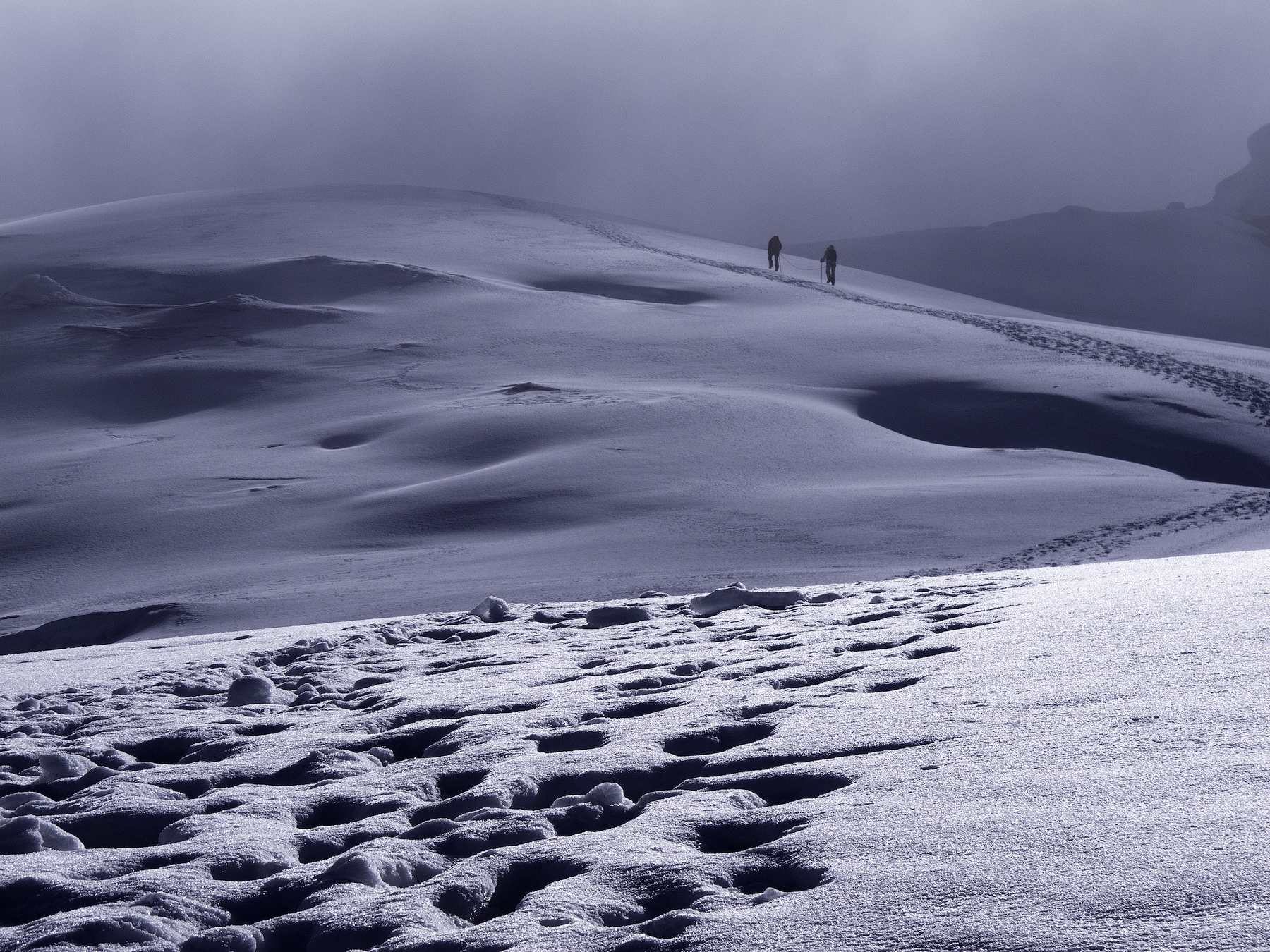 Stigen bär dig upp via morän i varierande lutning, med partier av scrambling där händerna lika gärna behövs som fötterna. Vid 4 750 meters höjd når du glaciären – och här tar äventyret en ny dimension. Gruppen förbereder sig för glaciärvandring, tar sig uppåt i mjuk lutning, passerar isiga sektioner och klättrar mot platån vid huvudkratern. Strax därefter – toppen. 5 221 meter över havet.